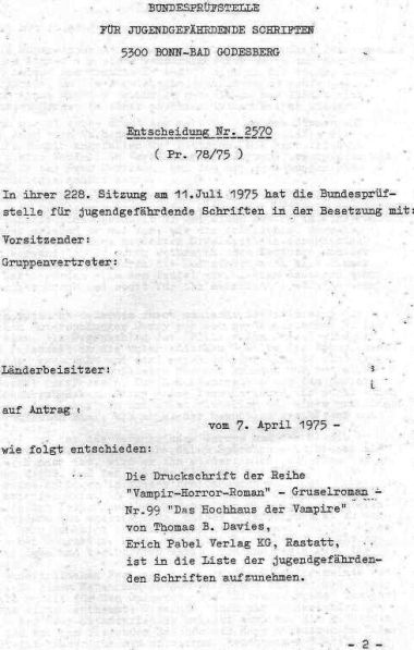Der Roman wurde ganz augenscheinlich nicht wegen irgendwelcher Grausigkeiten indiziert, sondern weil sich die kirchlichen Vertreter bei der damaligen Bundesprüfstelle wohl über den allzu laxen Umgang mit sakralen Riten und Gepflogenheiten echauffierten - in einem Heftroman dazu! __________________