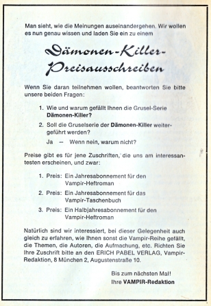 Um diesen ganz großen Fehler zu bereuen, hatten die zwei Verantwortlichen noch viele Jahre Zeit und Möglichkeit. Da wurde sehr viel Potenzial verschenkt, das Jahrzehnte später von Zaubermond geschickt erkannt und im "Haus Zamis" umgesetzt wurde. Für das Dämonenkiller-Taschenbuch wurde die Zamis-Familie nur noch im Ansatz genutzt, ehe die Reihe eingestellt wurde.