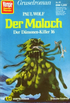 Ein beeindruckendes Wesen, das sich Ernst Vlcek hier mit dem Moloch ausgedacht hat. Eine Gestalt, die das Aussehen eines jeden anderen Menschen oder jeder beliebigen Sache annehmen kann - toll! In seiner Urform stelle ich mir dieses unförmige Schleimwesen wie eine perfekte Verbindung aller derartigen Kreaturen vor, die der geniale Maler Thole je auf die Cover des VHR gebannt hat, da gab es ja auch jede Menge Pizzagesichter mit Schwabbelkörpern.