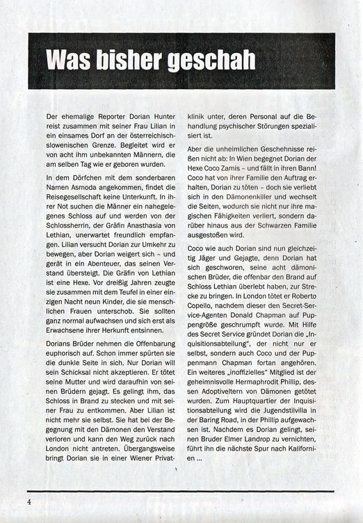 Dorian geht inzwischen davon aus, dass alle seine dämonischen Brüder den Schlossbrand überlebt haben und macht sich aktiv auf die Suche nach ihnen. Ich gehe auch davon aus, dass dem so ist und er sich nicht irrt. Für einen anfänglichen Plot bietet sich das Szenario hervorragend an, ich hoffe aber noch auf eine Erklärung, warum keiner von denen verbrannt ist.