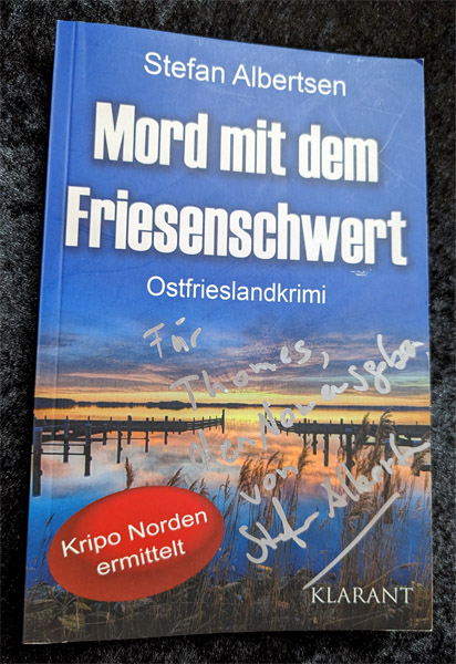 Von der Auflösung sah ich nichts. Ich sah ihn allerdings am Ausgang mit dem Buch von Stefan in der Hand und gratuliere Thomas auch noch einmal herzlich. Ich habe bereits alle bisherigen Kripo Norden-Krimis von Stefan Albertsen, sowohl im Bücherregal als auch gelesen.