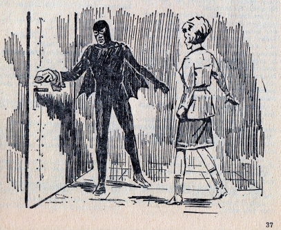 Der Zeichner Theo Thomas hat für den Fledermaus-Roman 398 auf den Seiten 12, 26, 37 und 49 vier Innenillustrationen gezeichnet. Dies ist eine davon.