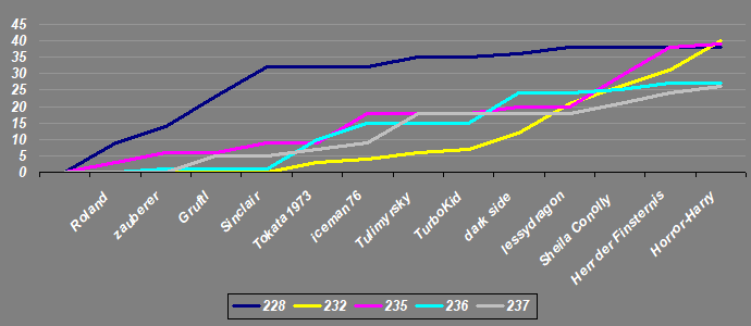 Bitte gebt wieder eure 5 Favoriten an, wobei Platz 1 die meisten Punkte und Platz 5 die wenigsten Punkte bekommt (Nach dem System 9-5-3-2-1).