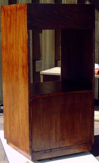 Heute ist es fast fertig geworden. Rollen sind drunter, Furnier ist auf dem Deckel, doppelte Rückwand für Elektrik (Steckdosen, Schalter, LED-Trafo fehlen noch), der obere Teil mit einem zusätzlichen Brett stabilisiert ... und nun klebt das ganze Ding wie ein Fliegenfänger wegen einer weiteren Schicht Holzwachs-Lasur.