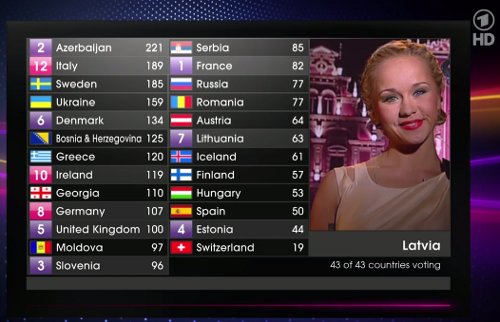 Ich hatte es aufgenommen, falls ich mal in Schlaf fallen sollte. Bei dem Voting fiel mir nur die Ukraine auf, die mit einem schwachen Beitrag, mächtig Punkte aus den Nachbarländern sammelte.