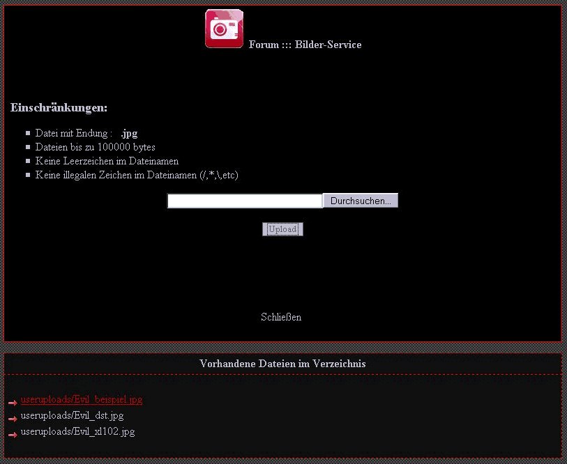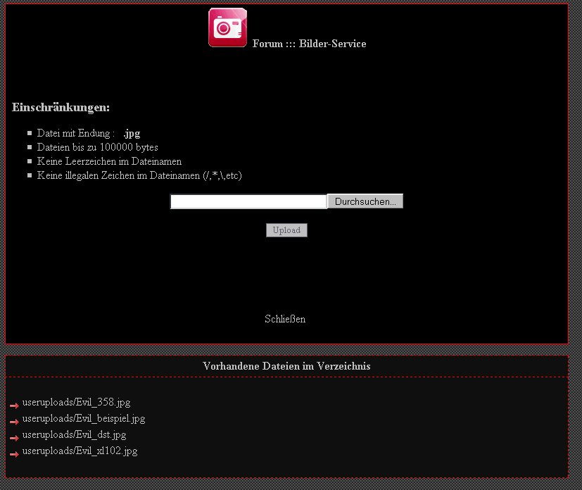 Nach dem Anmelden am Forum findet man unter dem Logo einen neuen Button : "Upload". Wenn man auf diesen klickt, sollte sich ein kleines Fenster zum Hochladen von JPG-Dateien (bis 100 Kilobyte Größe) öffnen.