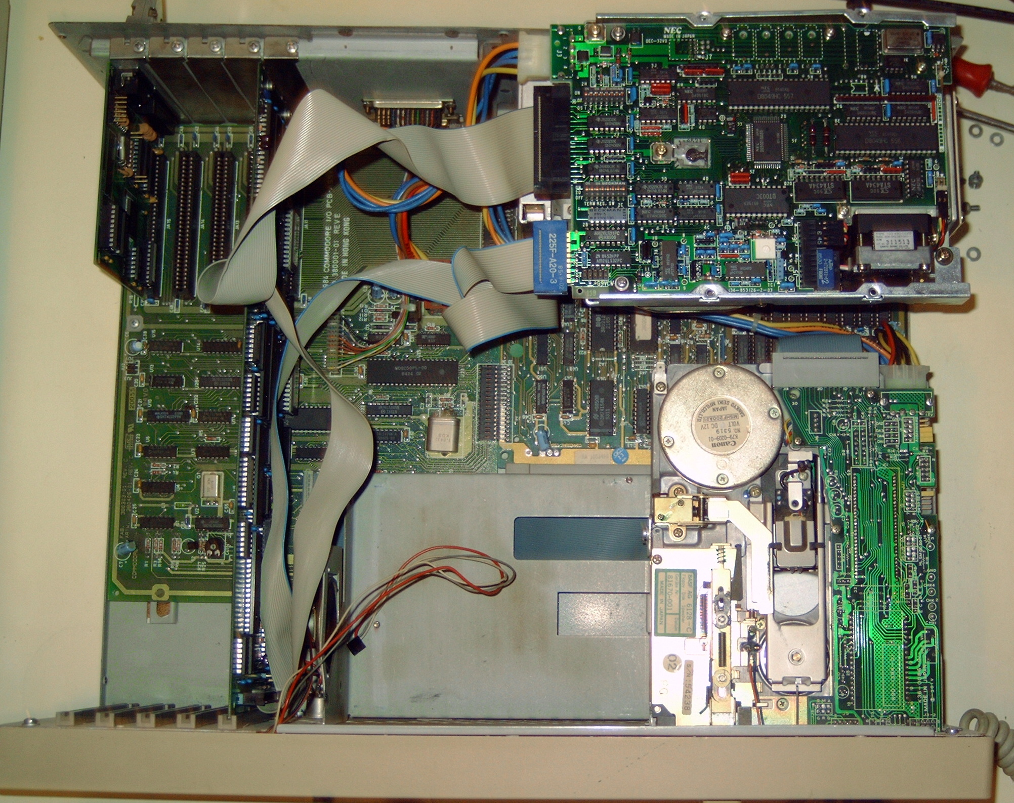 Die Hauptplatine wurde damals aus zwei Teilen zusammengesteckt, weil man noch nicht in der Lage war, derartig große Platinen in einem Layout zu erstellen. So befindet sich auf der rechten Seite der eigentliche PC und auf der linken Seite die Schnittstellen. Zur Kommunikation mit der Peripherie befinden sich an der Rückseite des Gehäuses zwei Steckplätze: eine serielle und eine parallele Schnittstelle. Für den MDA-Monitor wurde eine ISA-Karte eingesteckt, die auch noch einen Druckerport mitbrachte.