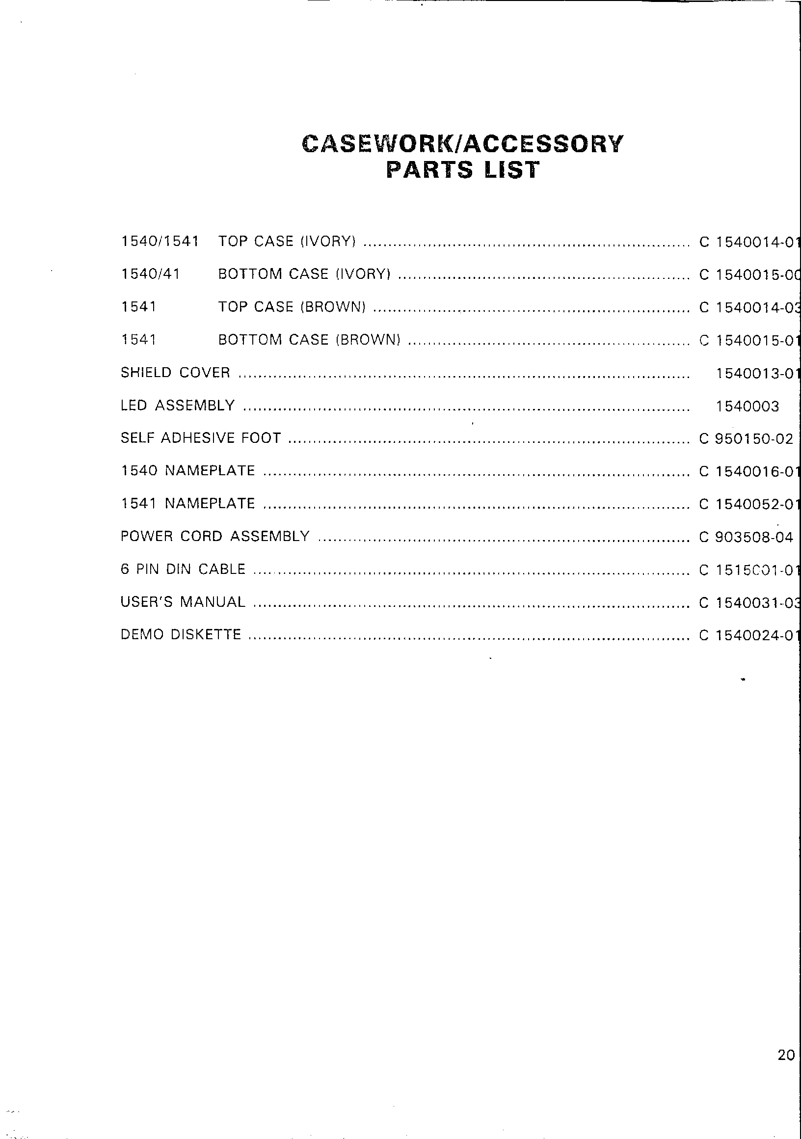 CASEWORK/ACCESSORY PARTS LIST