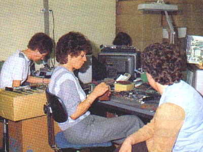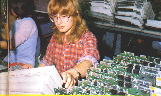 Direkt neben der Kantine im dritten Stock beginnt das Paradies für jeden VC2O- und C64-Fan. Hier ist das Band für die Heimcomputer. In der Montagehalle sitzen jeweils drei Frauen nebeneinander in einer Reihe und setzen die aus Fernost gelieferten Einzelteile zusammen.