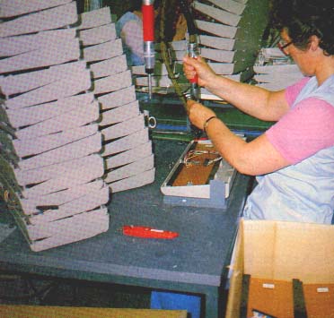 Die Frau links schraubt die Platinen; das Gehäuse-Unterteil;