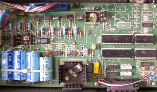 Blick auf die Platine zeigt den einfachen Aufbau mit 6504 CPU, 2 IO-Bausteinen und dem üblichen 2332er-ROM. Am unteren Rand der Leiterplatte ist der IEEE 488-Bus erkennbar.