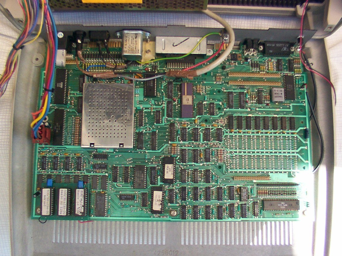 Die Platine des P500. In diesem Gerät habe ich die originalen ersten ROMs, gegen die etwas überarbeitete zweite Version ersetzt. Der Deckel auf dem VIC Abschirmgehaeuse ist leider kein Originalteil. Auf einem Foto mit grösserer Auflösung, kann man die Anordnung der Bauteile ansehen. |