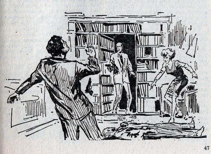 Der Zeichner Theo Thomas hat für den Fledermaus-Roman 387 auf den Seiten 11, 21, 35 und 47 vier Innenillustrationen gezeichnet. Dies ist eine davon.
