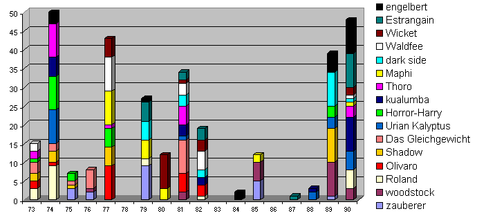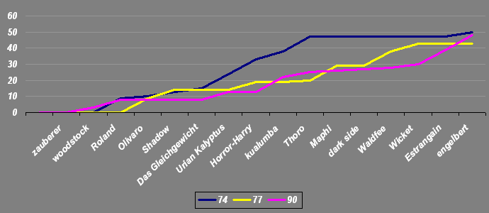 . Auf der Zielgeraden war der "mordende Mob" einfach nicht aufzuhalten. Bei den Teilnehmern stellt sich eine erstaunliche Konstanz ein ....schon bereits das vierte Voting hinter einander mit 16 Teilnehmern (im ersten waren es sogar stolze 19 gewesen) . Ein dickes Lob an Roland für die Betreuung, sowie an Olivaro für seine unermüdlichen "Erinnerungspost"