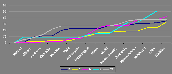 Bitte gebt wieder eure 5 Favoriten an, wobei Platz 1 die meisten Punkte und Platz 5 die wenigsten Punkte bekommt (Nach dem System 9-5-3-2-1).