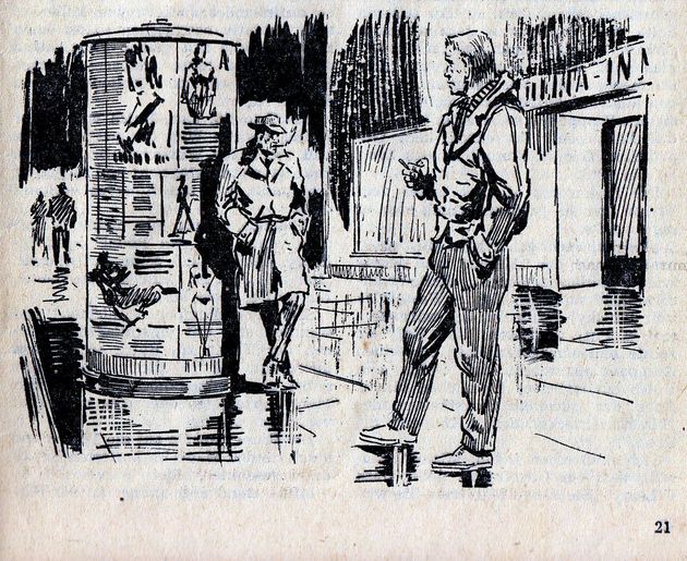 Der Zeichner Theo Thomas hat für den Fledermaus-Roman 319 auf den Seiten 12, 21, 33 und 42 vier Innenillustrationen gezeichnet. Dies ist eine davon.