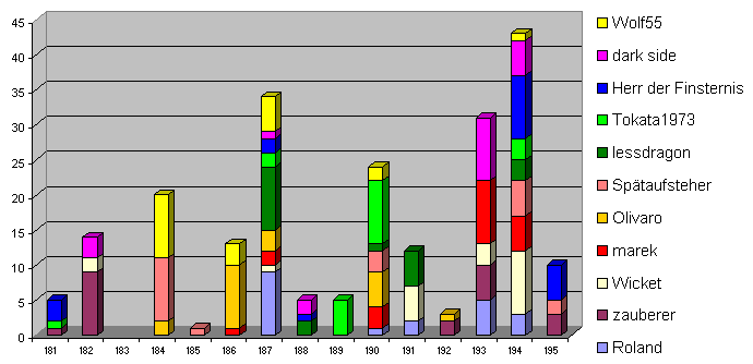 Bitte gebt wieder eure 5 Favoriten an, wobei Platz 1 die meisten Punkte und Platz 5 die wenigsten Punkte bekommt (Nach dem System 9-5-3-2-1).