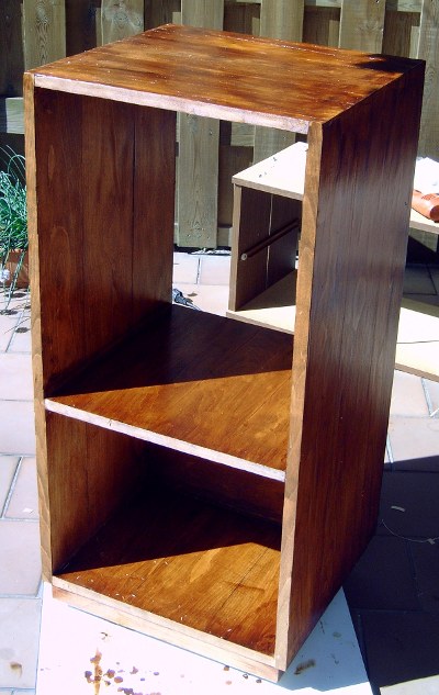 Heute ist es fast fertig geworden. Rollen sind drunter, Furnier ist auf dem Deckel, doppelte Rückwand für Elektrik (Steckdosen, Schalter, LED-Trafo fehlen noch), der obere Teil mit einem zusätzlichen Brett stabilisiert ... und nun klebt das ganze Ding wie ein Fliegenfänger wegen einer weiteren Schicht Holzwachs-Lasur.