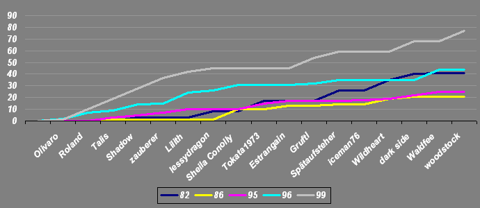 Verdienter Sieg für die blonde Sahne -....ähm Wolfsschnitte. Dank Waldfee ist die Kutsche am Ende noch auf's Podeum gerollt. Und woody hatte zum Schluß (mit Unterstützung von Olivaro) wenigstens noch (s) eine freie Leitung bekommen Dieser Beitrag wurde schon 1 mal editiert, zum letzten mal von dark side am 08.07.2018 07:32.