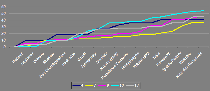 Unsere Reise begannen wir in Begleitung der (1. = 13) Schwadron der Todgeweihten. Wir verbrachten eine (2. = 07) Geisternacht am Stiefelhügel, bei der (3. = 09) Die Verdammten der Prärie uns zu einer Partie (4. = 10) Galgenpoker einluden. Es sah alles nach einer Dead Man's Hand aus, doch dann erschien der (5. = 11) Der Teufelsreiter und strich unser aller Seelen als Gewinn ein.