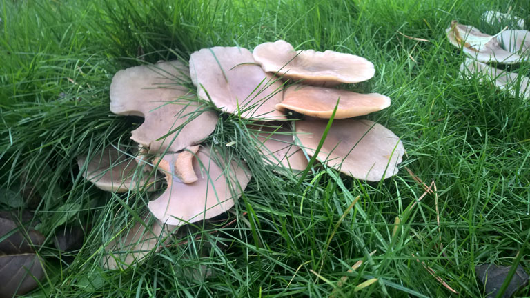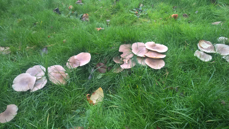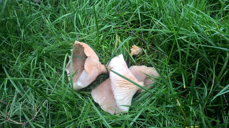 Mit dem Fachwissen ist es nicht allzu weit her. Wenn ein Pilz Lamellen hat, gibt es nur zwei Sorten, die ich nehme: Stockschwämmchen und Pfifferlinge; früher waren da noch Milchbrätlinge, aber der letzte Fund liegt da schon viele Jahre zurück. Alles andere Lamellige gehört nicht zu meinem Beuteschema. Was die Pilze auf den Bildern betrifft (die übrigens den Rasen verätzen und sich durch ihre