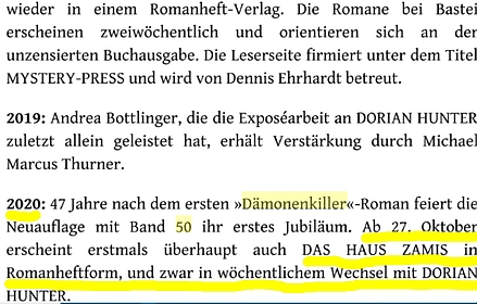 So wird nun eben frühzeitig, bevor diese olle LKS erscheint, bekannt, dass ab 27. Oktober 2020 die neue Serie "Das Haus Zamis" in Heftromanform im wöchentlichen Wechsel mit "Dorian Hunter" erscheint!